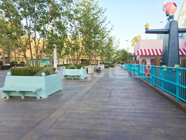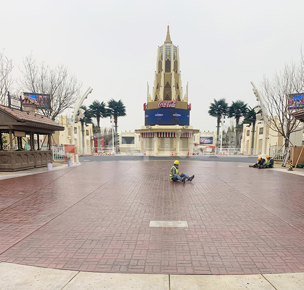 我司參與了北京環(huán)球影城好萊塢大道和小黃人兩個(gè)主題的路面鋪裝工作,鋪裝面積為2.4萬(wàn)㎡。其中包含了彩色混凝土礫石面藝術(shù)地坪、彩色混凝土壓印藝術(shù)地坪、彩色混凝土洗砂面藝術(shù)地坪、彩色混凝土鹽巖面藝術(shù)地坪、彩色混凝土仿泥仿塵藝術(shù)地坪、整體現(xiàn)澆路牙、掃毛面、座椅墻、化學(xué)著色等鋪裝硬景。