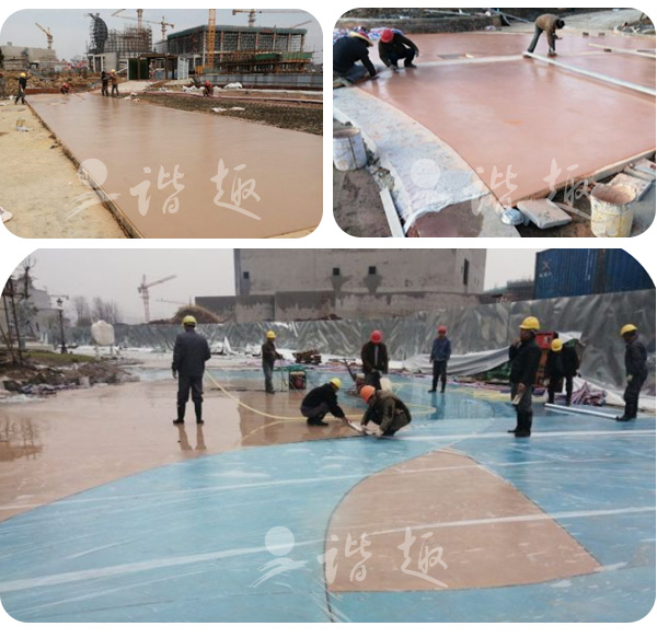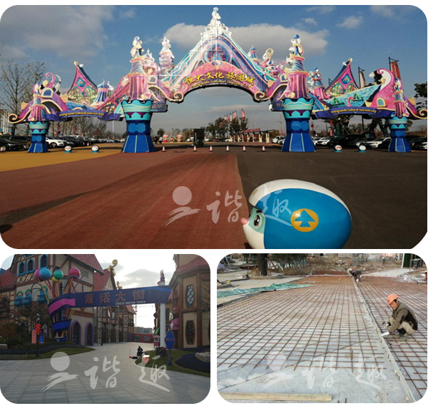 該工程工作量大、時(shí)間緊,任務(wù)急,質(zhì)量標(biāo)準(zhǔn)高,要求精細(xì)環(huán)保、自然、質(zhì)感細(xì)膩,總體藝術(shù)效果需和樂園整體環(huán)境協(xié)調(diào)統(tǒng)一。 硬質(zhì)景觀地面工程采用10cm厚通體彩色混凝土,款型有洗砂面,壓印混凝土地面,露骨料混凝土地面等。