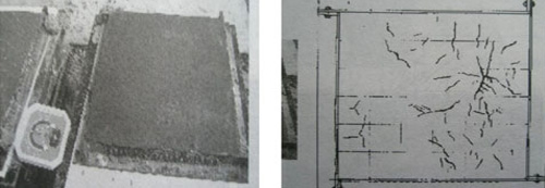 左圖:同一環(huán)境中不同保濕條件下的試件; 右圖:未覆蓋的試件裂縫開展情況(實測描繪)