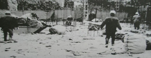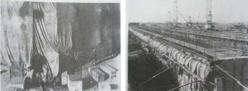 圖-8 施工時采用篷布擋風 圖-9 施工后采用外掛麻袋