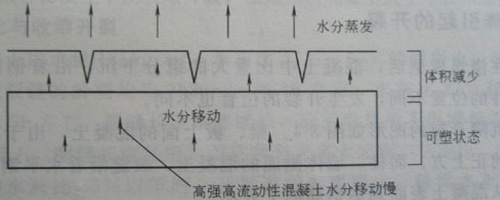 如果混凝土溫度比氣溫高(因陽光暴曬或其它原因,比如攪拌車到現(xiàn)場后,混凝土長時間不能澆灌入模,水化已經(jīng)開始),即使氣溫涼爽且相對濕度為100%的飽和條件下,水分從混凝土表面蒸發(fā)的速率也相當可觀,因此,在涼爽、潮濕的氣候下混凝土也可能出現(xiàn)塑性裂縫。