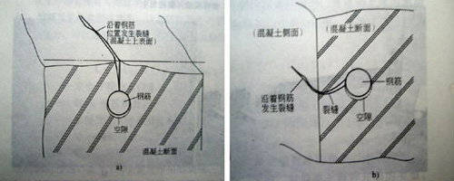 a)沿著鋼筋上表面發(fā)生裂縫 b) 沿著側(cè)面鋼筋而發(fā)生裂縫